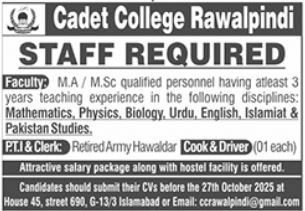 Apply for teaching and support staff at Cadet College Rawalpindi (CCR) — vacancies for lecturers…