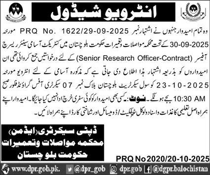 Apply for the Senior Research Officer (Contract) interview at Communication & Works Department Balochistan. Interview…