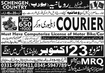MRQ International is hiring Courier and Delivery Workers for Romania (Schengen). Interviews Rawalpindi 23 Oct…