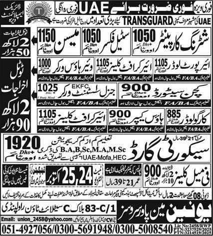 Union Manpower Services is hiring Kitchen Stewards, Cargo Loaders and other staff for Abu Dhabi…
