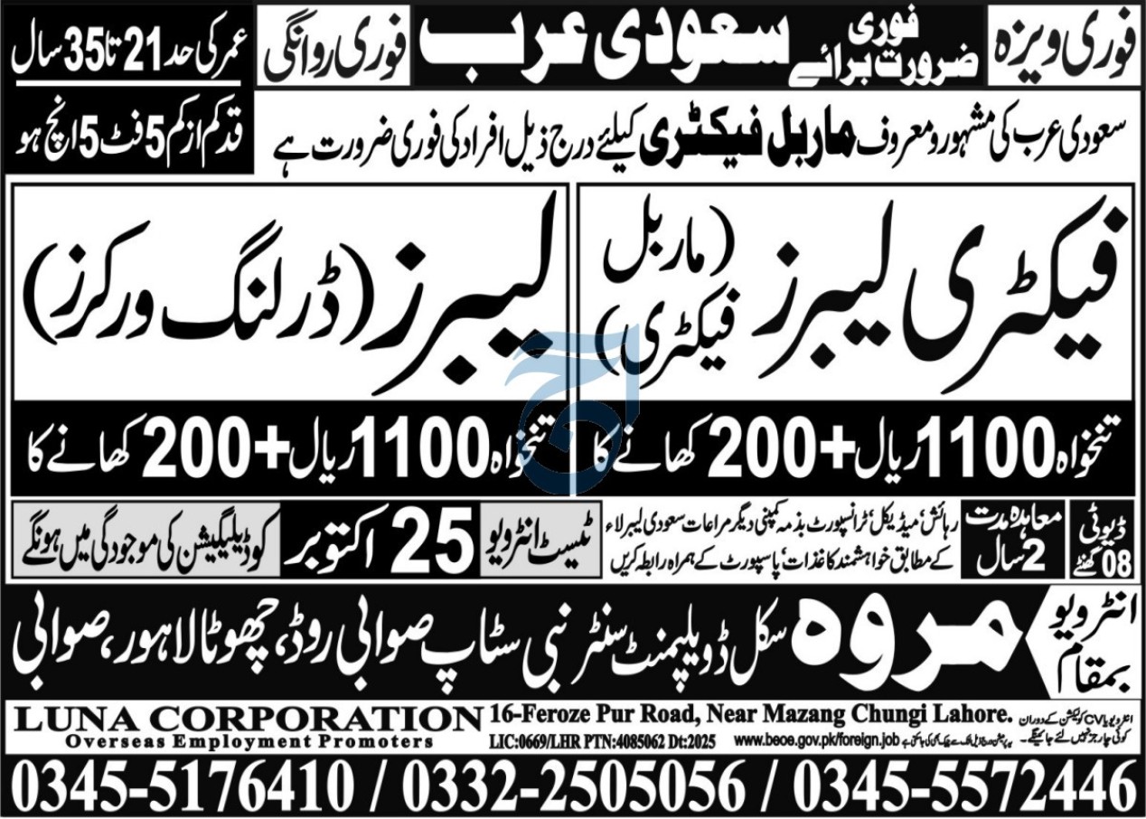 Apply for Labour and Factory Labour positions at Luna Corporation Riyadh (Saudi Arabia). Urgent overseas…