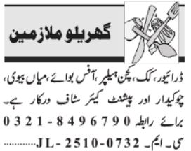 House invites applications for domestic staff jobs in Lahore (Driver, Cook, Kitchen Helper, Patient Care,…