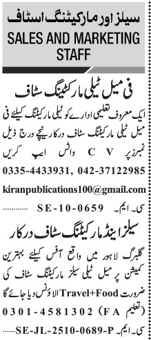 Marketing Company in Gulberg Lahore seeks Sales & Marketing, Telemarketing Officers and Staff. Apply by…