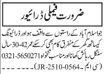 Apply for Family Driver/Driver positions in Islamabad (posted 20 Oct 2025). Middle/Matric preferred. Age 30–42,…
