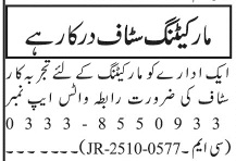 Apply for Marketing Staff and Marketing Officer positions in Islamabad announced in Jang Classifieds (20…