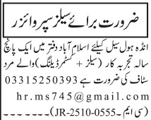 Private company in Islamabad seeks Sales Supervisor, Sales Staff and Customer Dealer. Matric/Intermediate candidates with…