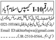 Dar e Arqam Schools Pakistan (I-10 Campus, Islamabad) is hiring English, Montessori, Science, Maths teachers,…
