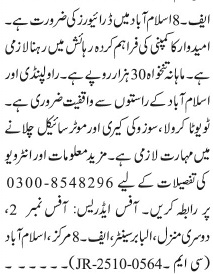 Private Company in F-8 Islamabad seeks LTV Drivers and Drivers. Monthly salary PKR 30,000. Apply…