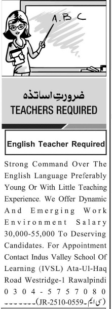 Apply for Teacher & English Teacher positions at Indus Valley School System (IVSL), Westridge I…