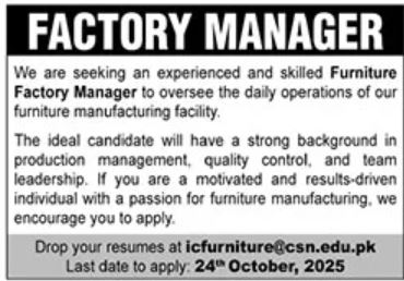 Apply for Factory Manager position in Lahore (24 Oct 2025). Private furniture manufacturer seeks experienced…