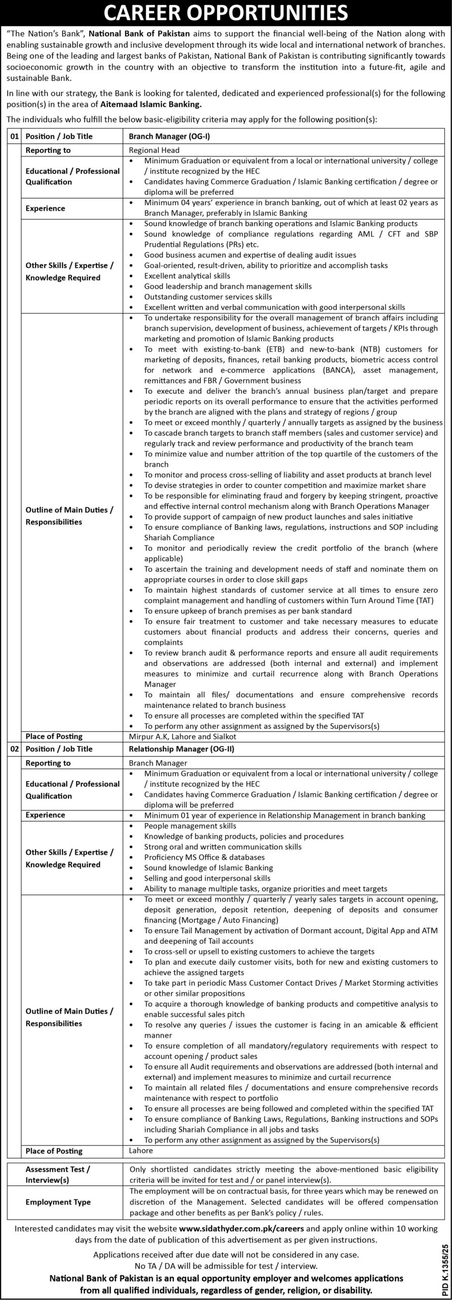 Apply for Branch Manager & Relationship Manager positions at National Bank of Pakistan (NBP) Lahore.…