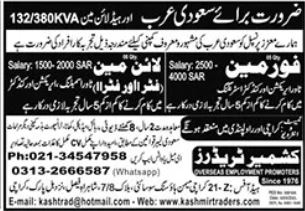 Apply for Foreman, Fitter and Lineman positions with Kashmir Traders Overseas Employment Promoters (Saudi Arabia)…