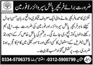 Apply for Foreman and Furniture Polish Supervisor positions at Mirari Furniture Pvt Ltd Karachi. Jobs…