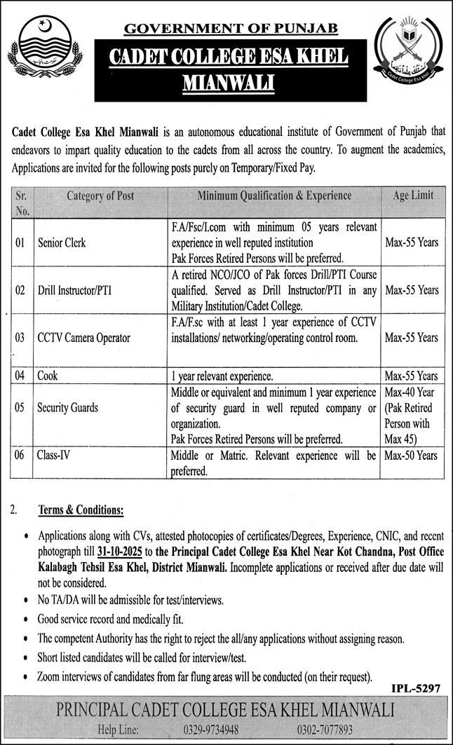 Apply for Cadet College Esa Khel (CCEK) Mianwali jobs 2025. Vacancies for Senior Clerk, Drill…