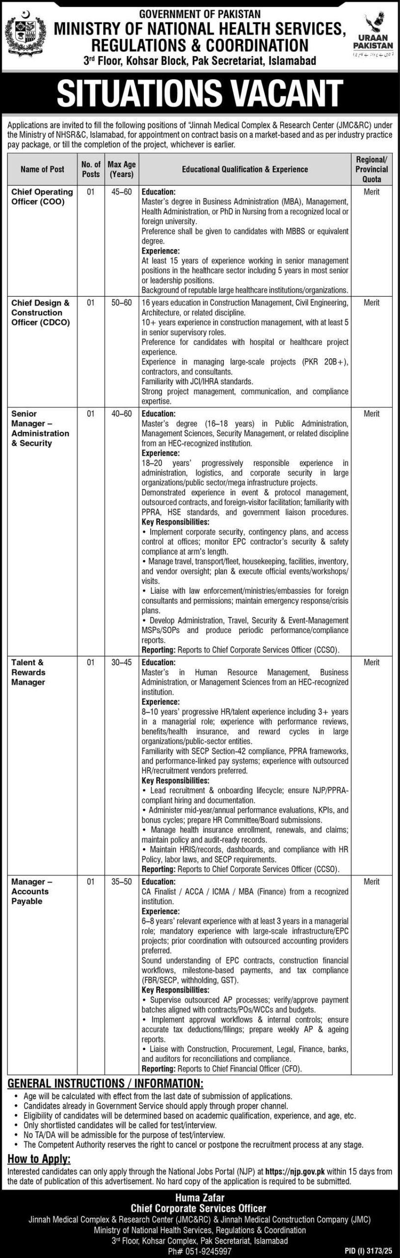 Apply for multiple management and healthcare roles at Ministry of National Health Services Regulations &…