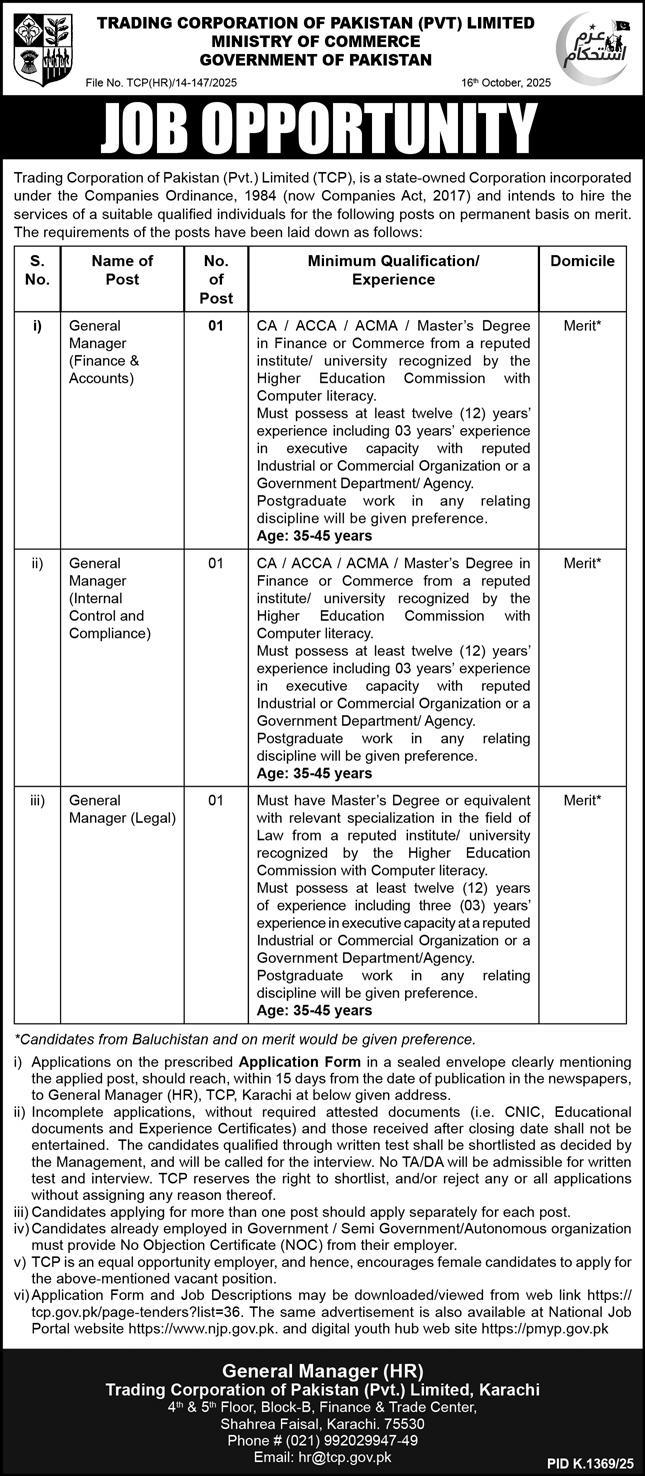 Apply for General Manager roles at Trading Corporation of Pakistan (TCP) Karachi 2025. Permanent positions…