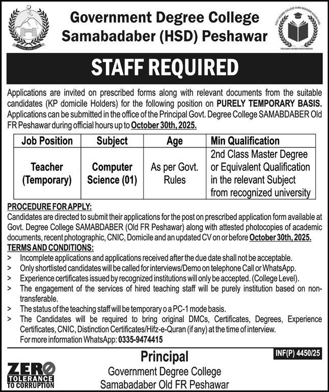 Apply for the temporary Computer Science Teacher post at Government Degree College Samabadaber (Old FR),…