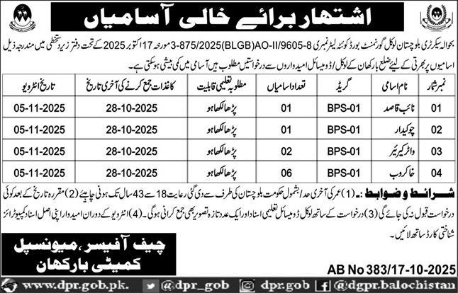 Apply for Municipal Committee Barkhan Jobs 2025 — vacancies for Chowkidar, Naib Qasid, Water Carrier,…