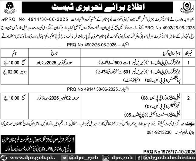 Population Welfare Department Quetta announces written test schedule for Family Welfare Workers, OT Technicians, Family…