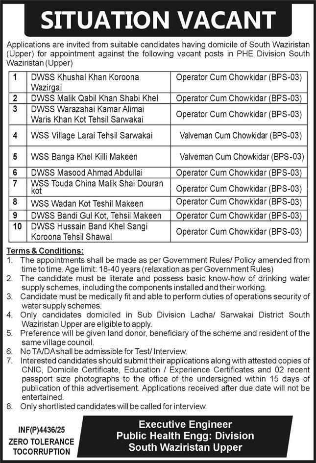 Apply now for Public Health Engineering Division South Waziristan (Upper) vacancies 2025 — Operator Cum…