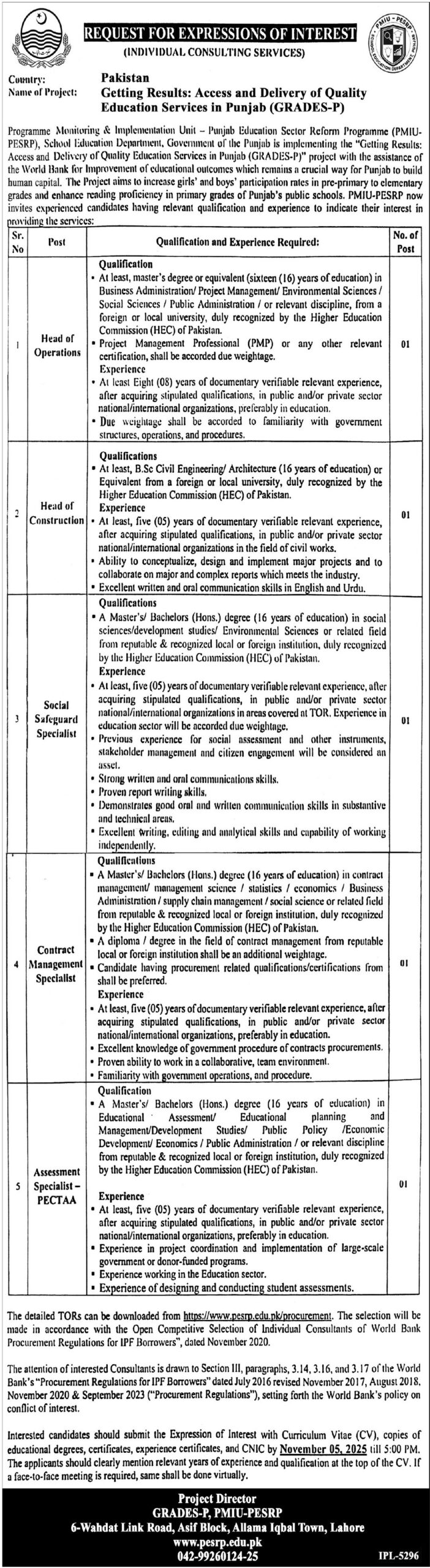 Apply for Punjab School Education Department PMIU-PESRP jobs 2025 in Lahore. Contract Management Specialist, Head…