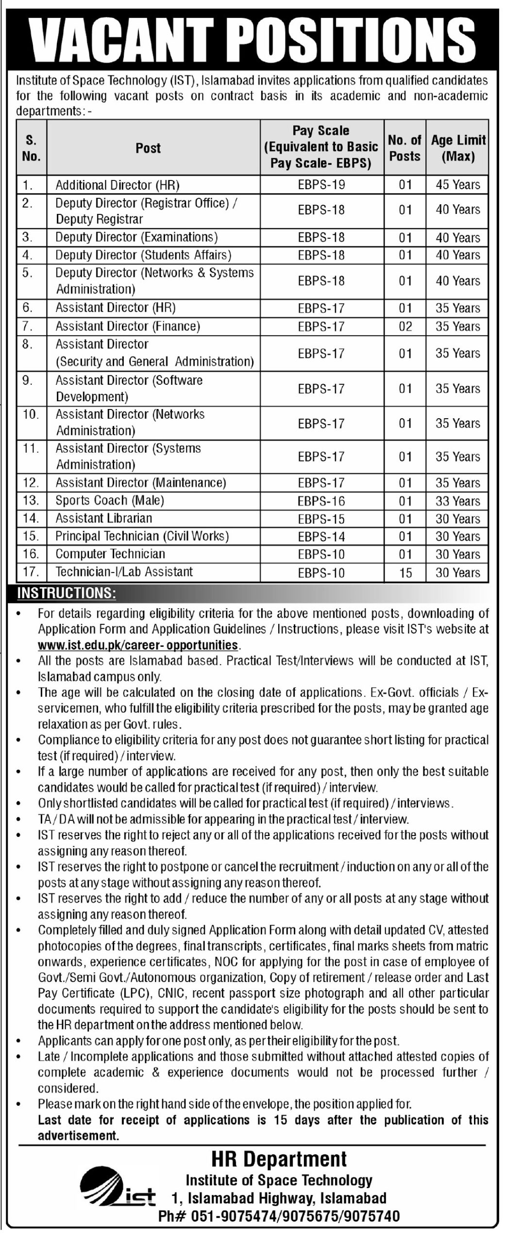 Apply for project-based Lab Technician and Clerk (Office Assistant) positions at Institute of Space Technology…