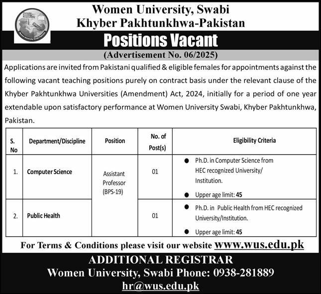 Women University Swabi invites applications from qualified female candidates for Assistant Professor positions in Computer…