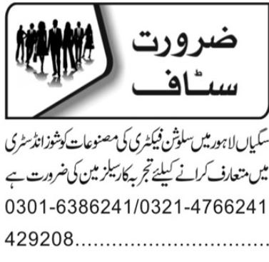 Apply for experienced Salesman and Sales Staff positions at Shoes Company in Saggian, Lahore. Intermediate…