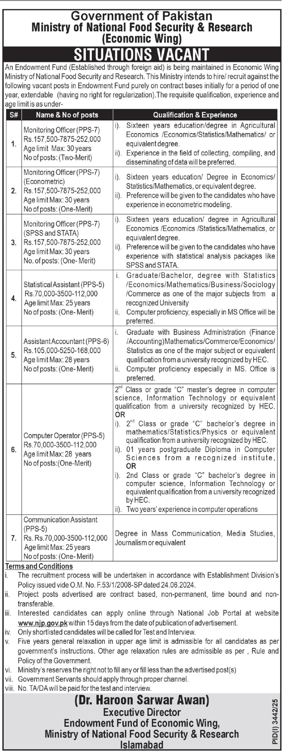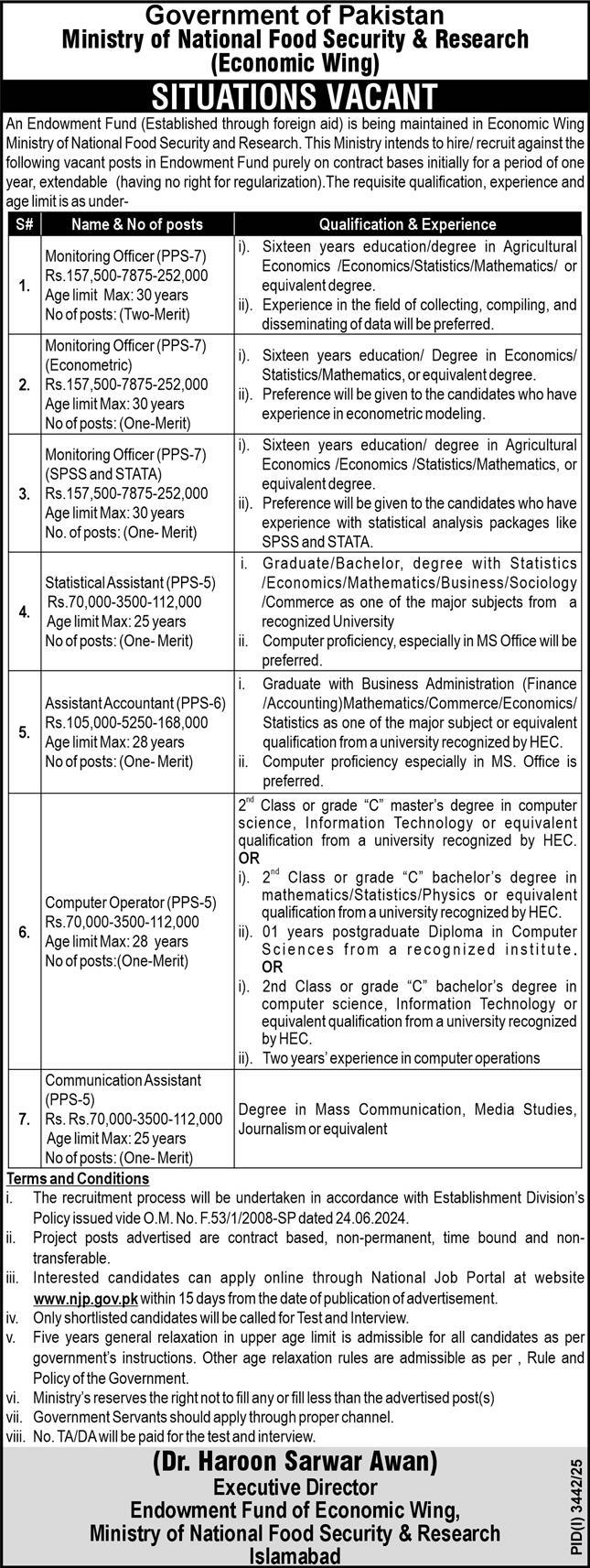 Apply for MNFSR Jobs 2025 in Islamabad: Monitoring Officer, Communication Assistant, Statistical Assistant, Assistant Accountant,…