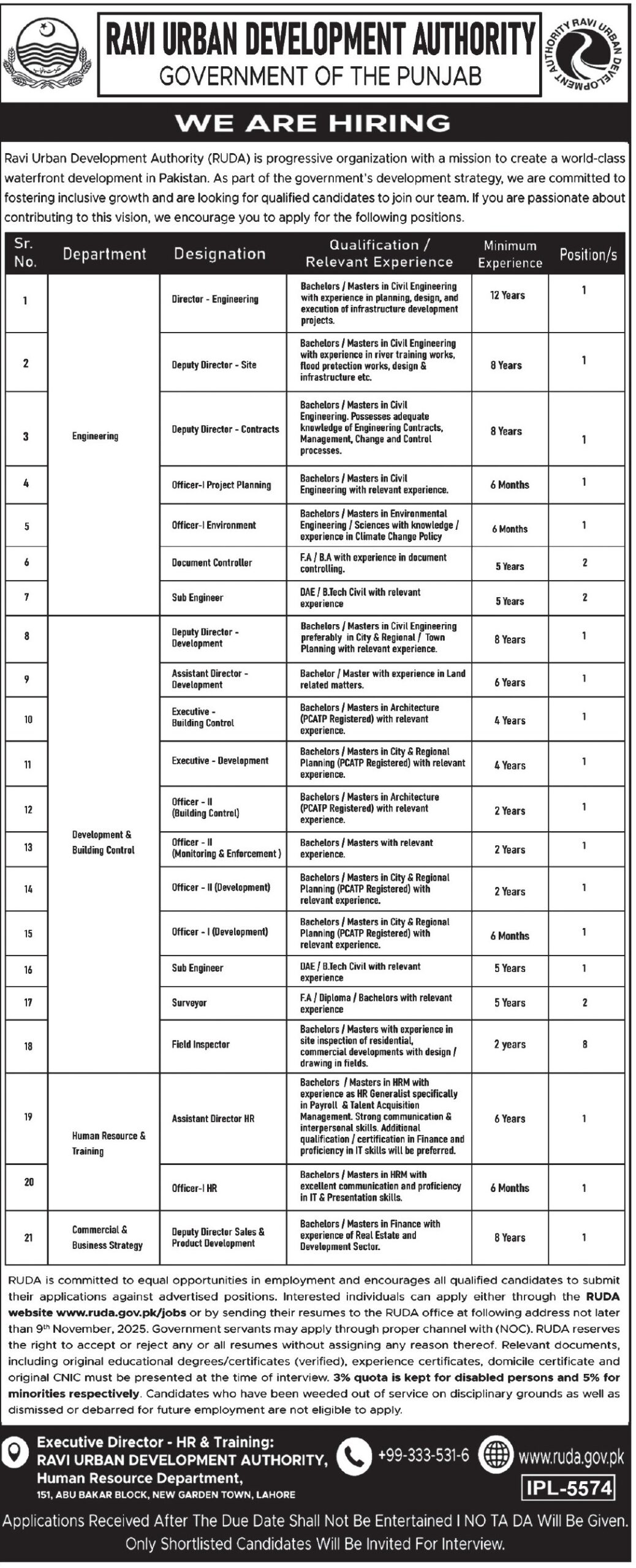Apply for RUDA Lahore jobs 2025 — multiple positions including Director Engineering, Deputy Directors, Officers,…