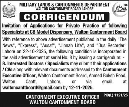Apply by 12 Nov 2025 for Walton Cantonment Board (Military Lands & Cantonments Department) medical…