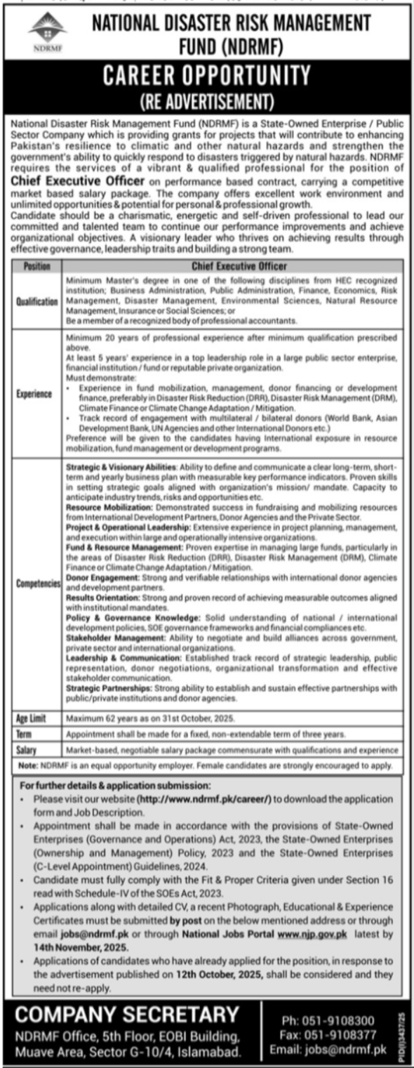 Apply for Chief Executive Officer (CEO) at National Disaster Risk Management Fund (NDRMF) Islamabad. Performance-based…