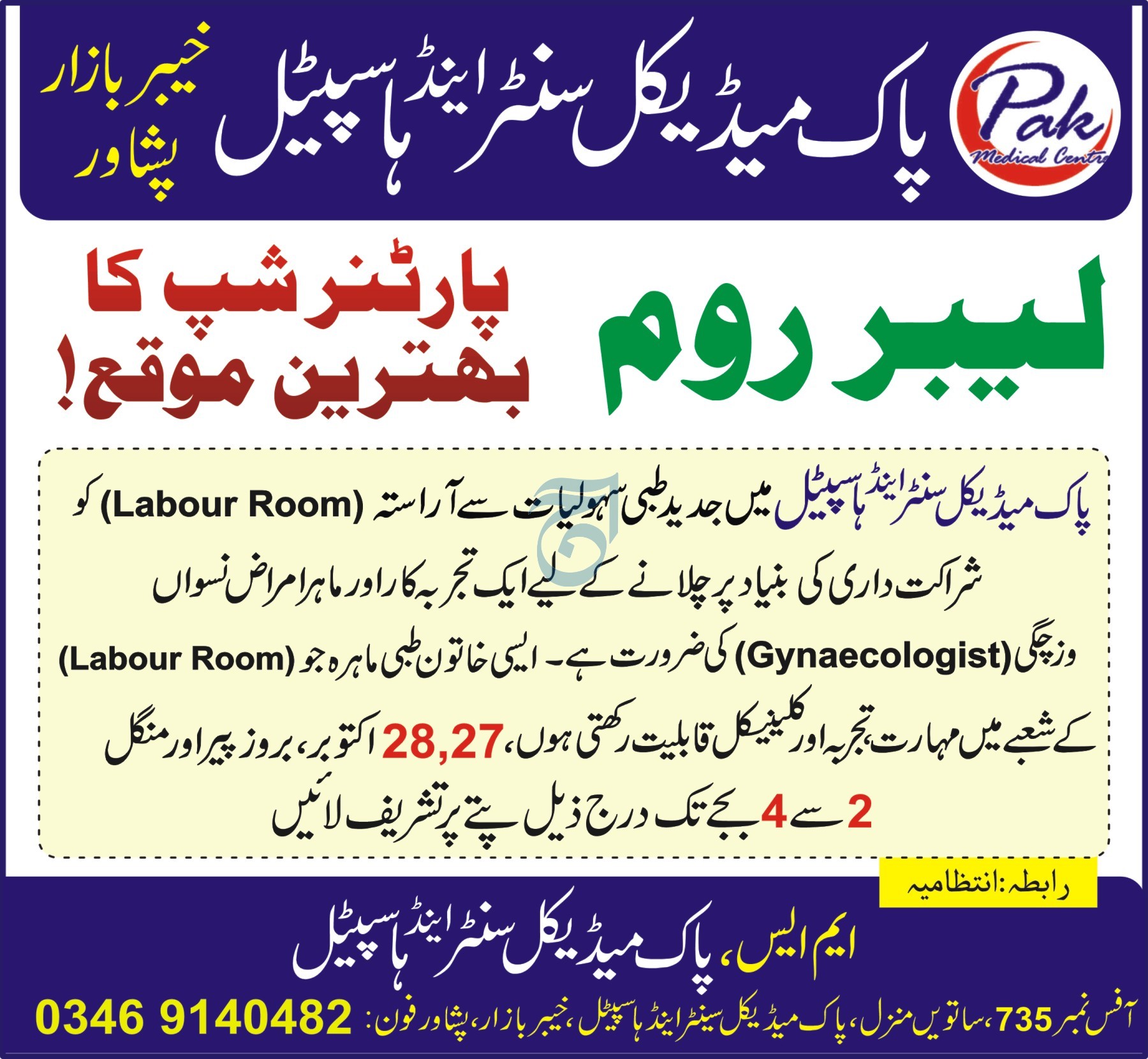 Apply for Gynaecologist position at Pak Medical Centre & Hospital Peshawar. MBBS required. Posted 27…
