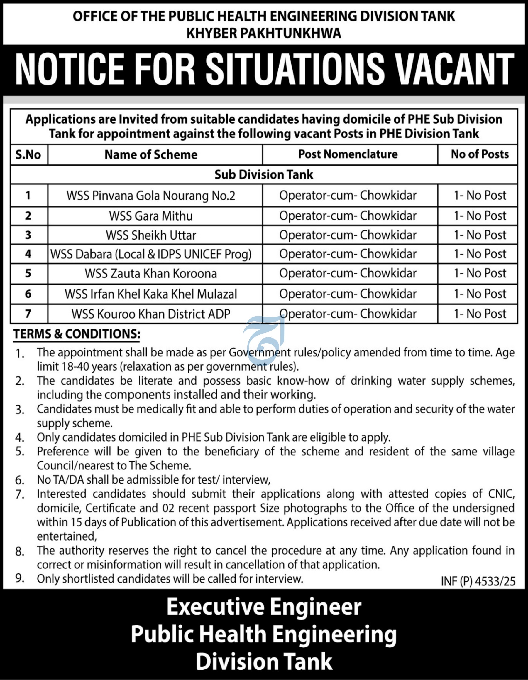 Apply for Operator Cum Chowkidar at Public Health Engineering Division Tank (KPK) — vacancies advertised…