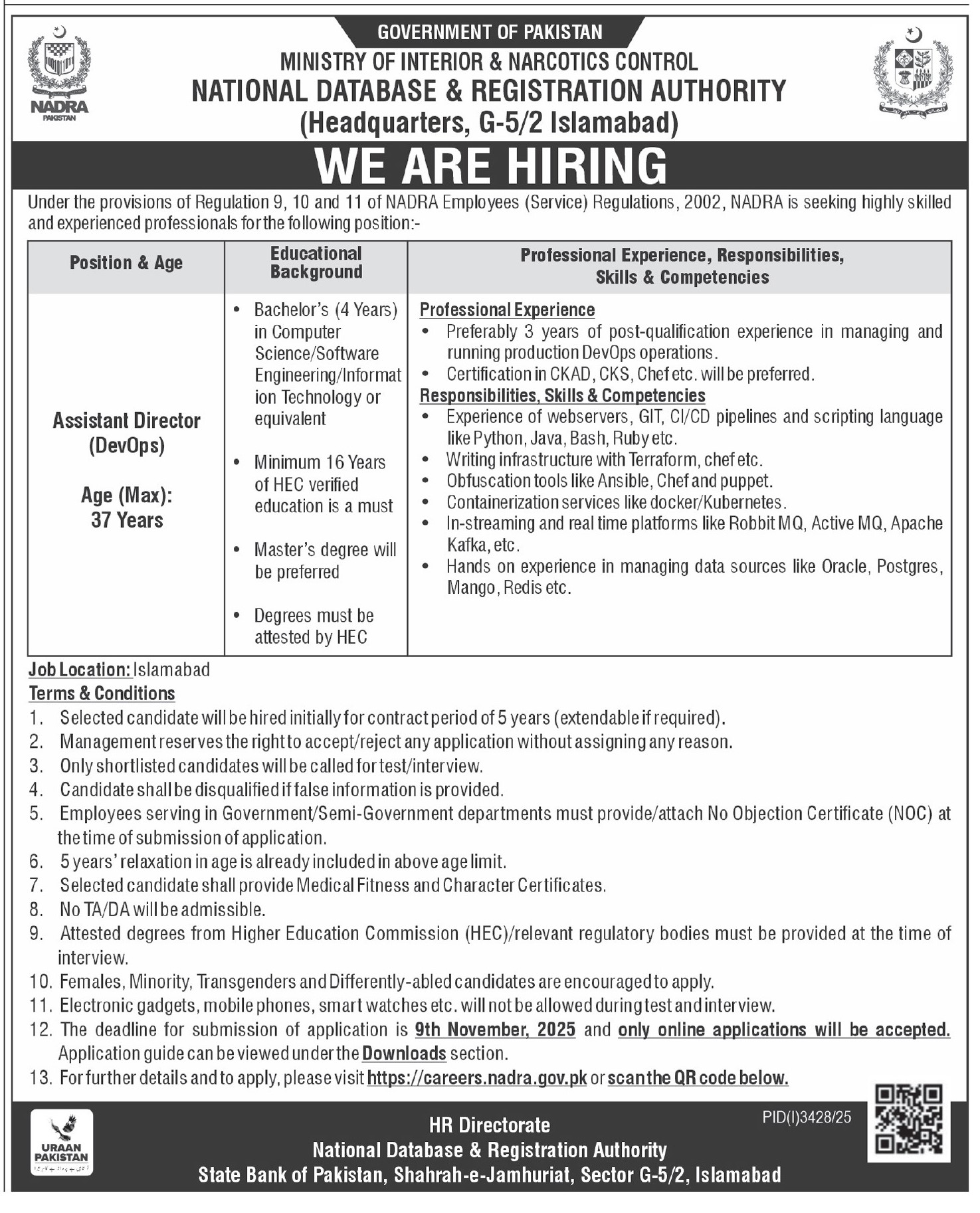 Apply for NADRA jobs 2025 in Islamabad: Assistant Director DevOps and other professional positions. Bachelor's/Master's…