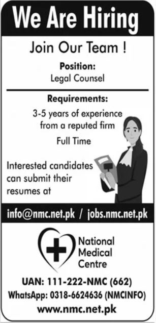 Apply for Legal Counsel (Full-Time) at National Medical Centre Pvt Ltd, Karachi. 3-5 years experience…