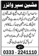 Apply for Machine Supervisor and Supervisor positions at a Plastic Factory in Karachi. Intermediate required.…