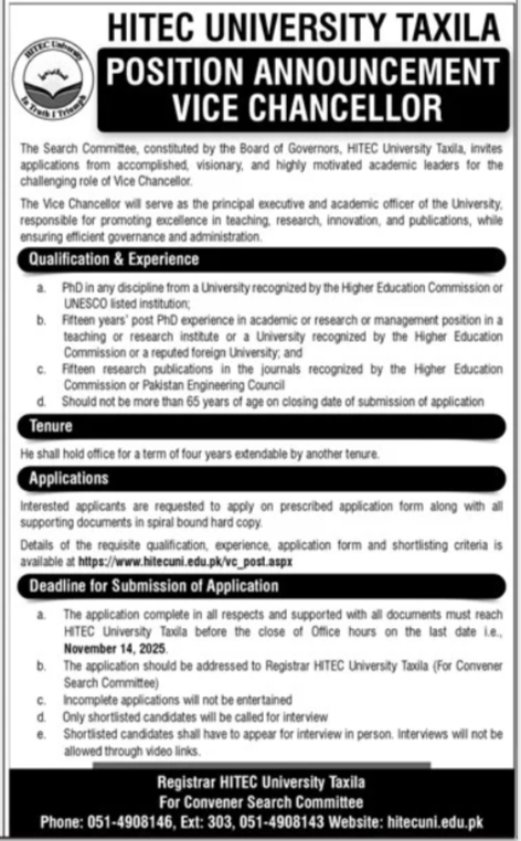 Apply for the Vice Chancellor position at HITEC University Taxila (2025). PhD required, 15 years…