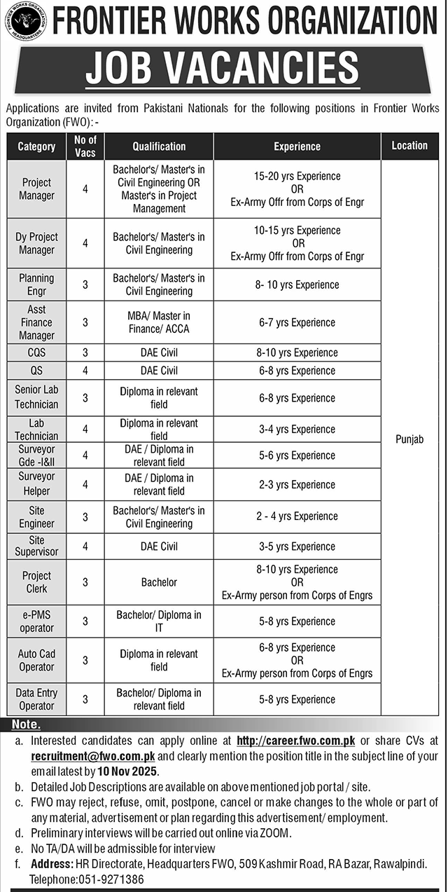 Frontier Works Organization (FWO) is hiring for multiple positions in Rawalpindi. Apply by 10 November…