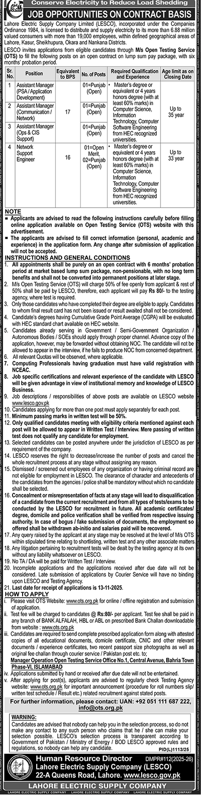 Apply for Assistant Manager and Network Support Engineer positions at Lahore Electric Supply Company (LESCO)…