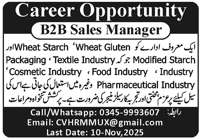 Apply for the B2B Sales Manager position in Lahore (Last date 10 Nov 2025). Private…