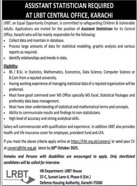 Apply for Assistant Statistician at LRBT Karachi (2025). BS/MS in Statistics, Maths, Data Science or…