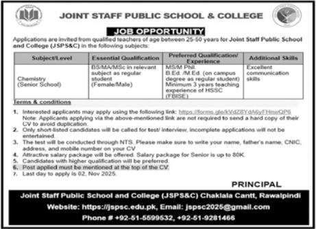 Apply for the Chemistry Teacher position at Joint Staff Public School & College Chaklala Rawalpindi.…