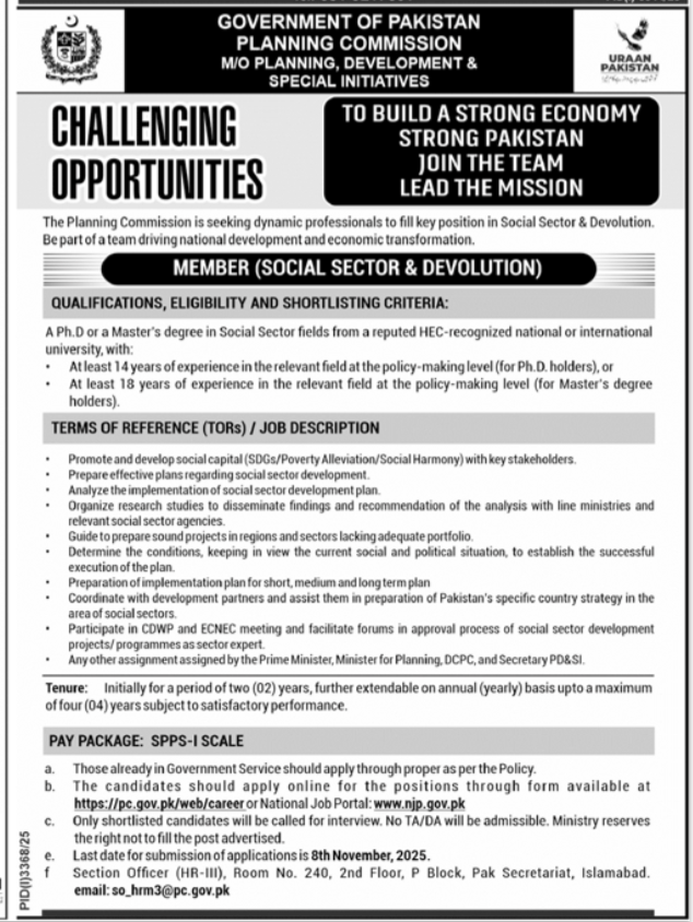 Apply for Member (Social Sector & Devolution) at Planning Commission Islamabad. PhD preferred. Last date…