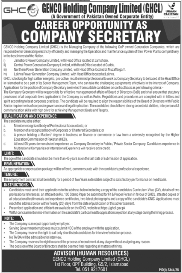 Apply for the Company Secretary position at Genco Holding Company Limited (GHCL) Islamabad. Contract post,…