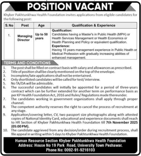Apply for Managing Director at Khyber Pakhtunkhwa Health Foundation (Peshawar). Master’s in Public Health required;…