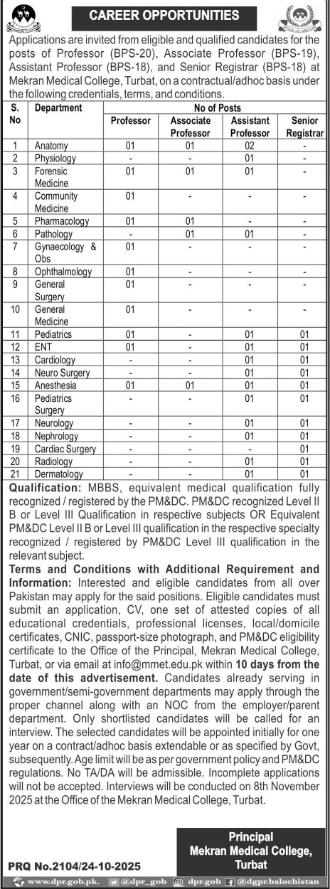 Apply for faculty and senior registrar positions at Mekran Medical College, Turbat (posted 25 Oct…