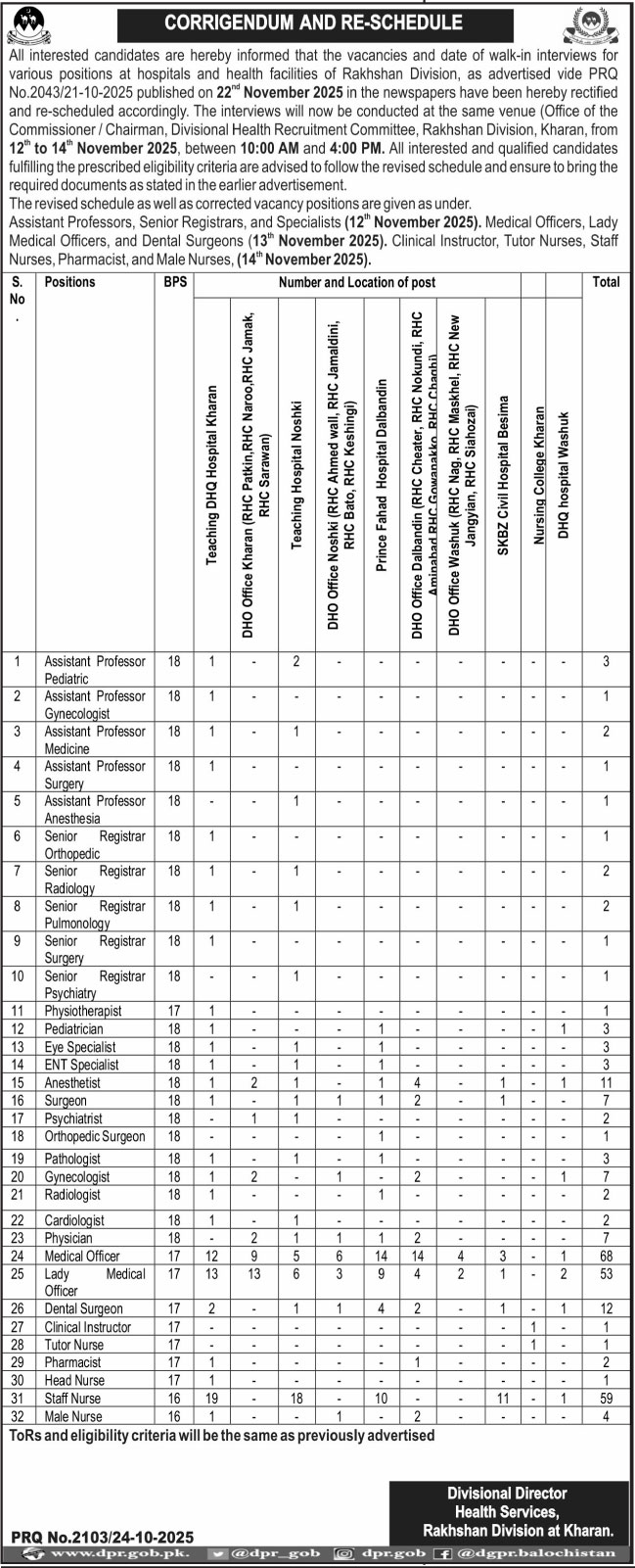 Health Department Balochistan announces walk-in interviews (12–14 Nov 2025) for multiple medical and nursing posts…