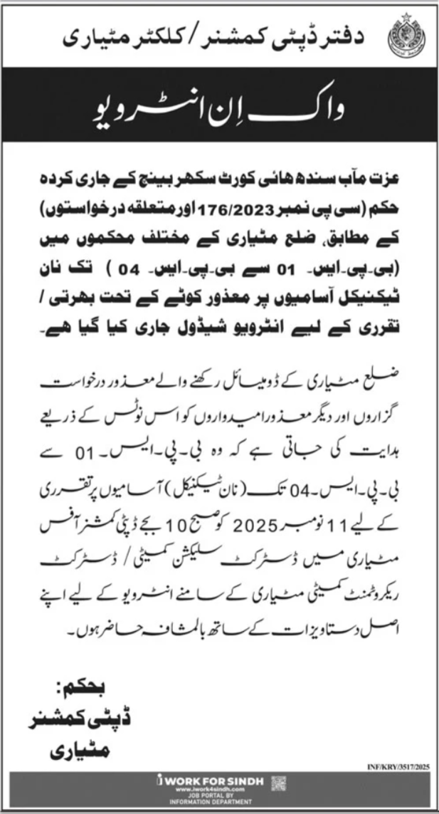 Walk-in Interviews for BPS-1 to BPS-4 Jobs — Deputy Commissioner Office Matiari 2025