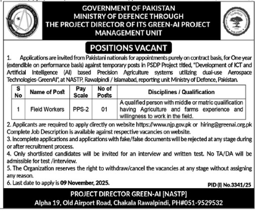 Apply for Field Workers (PPS-2) at Ministry of Defence Green-AI project in Rawalpindi. Contract basis…